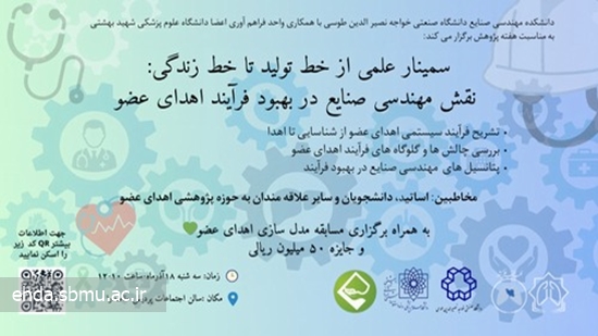 به مناسبت هفته پژوهش و در گامی ارزشمند جهت ایجاد پیوند میان حوزه‌های علوم پزشکی و مهندسی، واحد فراهم‌آوری اعضای پیوندی دانشگاه علوم پزشکی شهید بهشتی با همکاری دانشکده مهندسی صنایع دانشگاه صنعتی خواجه نصیرالدین طوسی، رویدادی علمی و متمایز را برگزار می‌کند. این سمینار که تحت عنوان «از خط تولید تا خط زندگی» نام‌گذاری شده است، در تاریخ ۱۸ آذرماه از ساعت ۱۰ الی ۱۲ در دانشگاه خواجه نصیر ، سالن اجتماعات پردیس ملاصدرا برگزار خواهد شد و محوریت اصلی آن، بررسی نقش کلیدی و راهگشای مهندسی صنایع در بهبود و بهینه‌سازی فرآیند حیاتی فراهم آوری اعضا از شناسایی تا اعزام کوردیناتور و اهدای عضو  است.